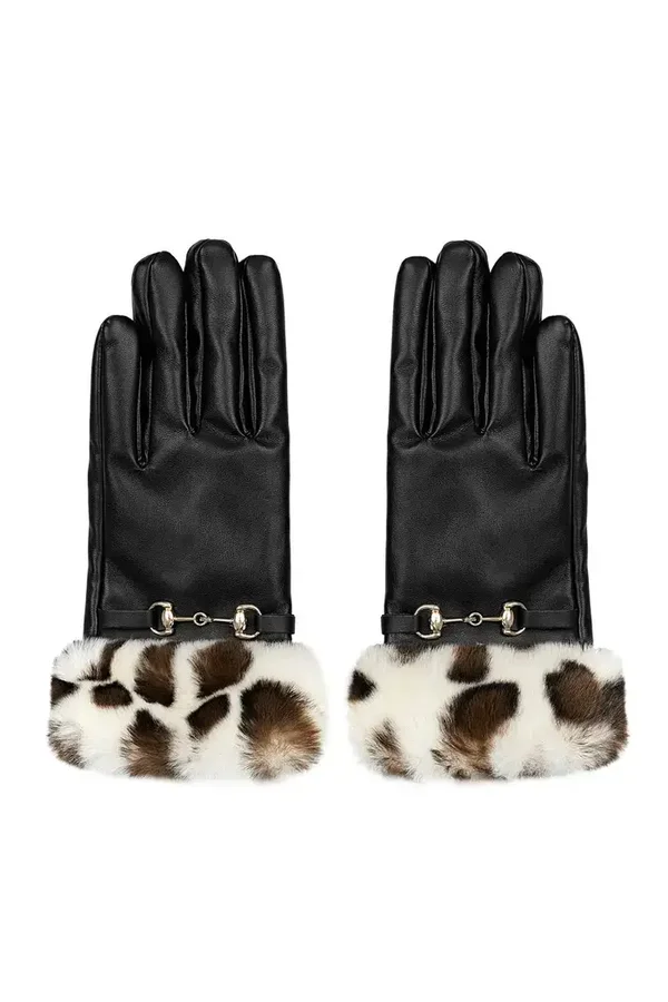 Handschoenen gesp met faux fur dierenprint - zwart beige