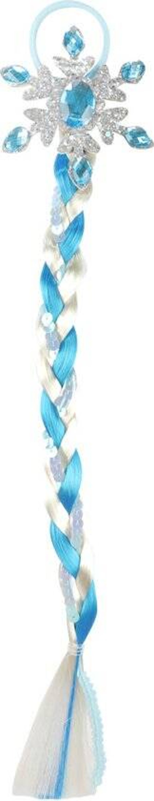 Verkleed je als een prachtige ijsprinses met deze mooie haarvlecht in je haren! Met een elastiek bevestig je de haaraccessoire aan je eigen haar. De vlecht bestaat uit drie stroken kunsthaar: blauw, wit en glanzende pailletten. Bovenaan de vlecht vind je een mooi ijskristallensieraad met kunststof diamantjes.